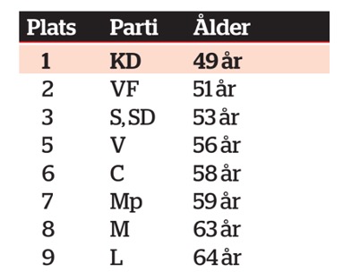 Medelåldern på valsedeln är alltid av intresse för väljarna. Yngst genomsnittsålder har KD med 49 år, högst genomsnittsålder har L med 64 år. Även om M och VF inte uppger några åldrar år dessa lätta att ta reda på.