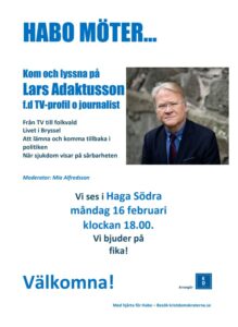 Välkommen till Habo möter med Lars Adaktusson Bild Vi hoppas på att vi ses i Haga Södra måndag 16 februari klockan 18.00. Vi bjuder på fika! Affisch 16 feb 2026 Lars Adaktusson