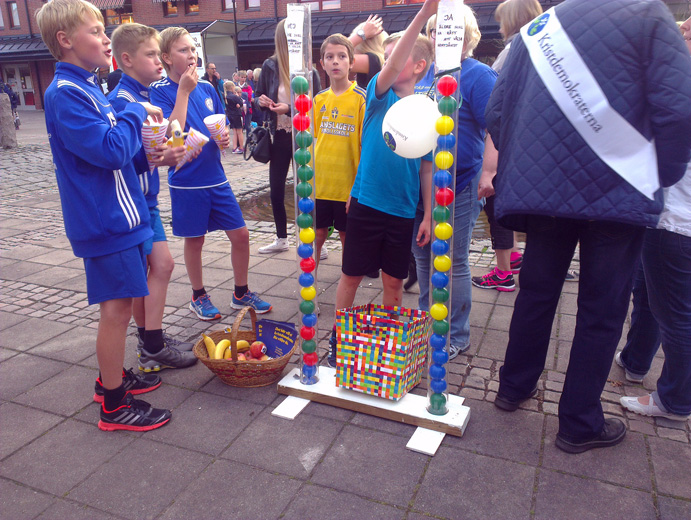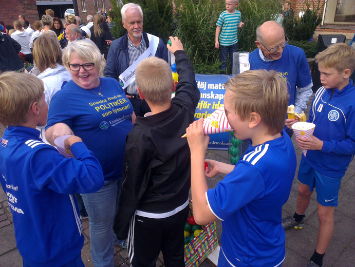 Efter radiosändningen åkte jag direkt till Skillingaryd för att vara med på vaggerydsavdelningens aktiviteter under Pangstafetten. Alla aktiviteter utgick från torget. Kristdemokraterna ställde upp med två lag i stafetten och hade fått ihop ett stort gäng som hjälpte till med allt annat också. Jag hade tagit med mig distriktets röstningsrör och alla barn ville vara med och rösta om mer idrott i skolan.