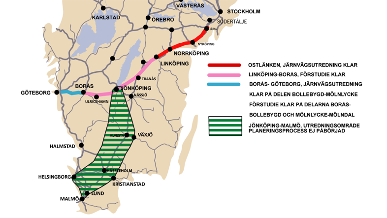 - Området som utreds för höghastighetsjärnvägens sträckning mellan Jönköping och Malmö. (Bild: Sverigeförhandlingen)