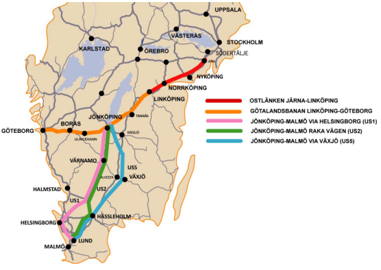 Trafikverket har analyserat de regionalekonomiska effekterna av de tre tänkbara sträckningarna av höghastighetsjärnvägen mellan Jönköping och Malmö. De officiella beräkningarna bygger på en teoretisk modell kallad Sampers/Samkalk. Enligt dessa beräkningar ger sträckningen raka vägen över Värnamo och Ljungby (US2) störst regionalekonomisk nytta med knappt 135 miljarder kr totalt över kalkylperioden, vilket är knappt 9 respektive 12 miljarder mer än US1 via Helsingborg respektive US5 via Växjö. Dessa beräkningar är naturligtvis inte det enda planeringsunderlaget för Sverigeförhandlingen, men de ger åtminstone en hint om att den närmaste vägen är att föredra.