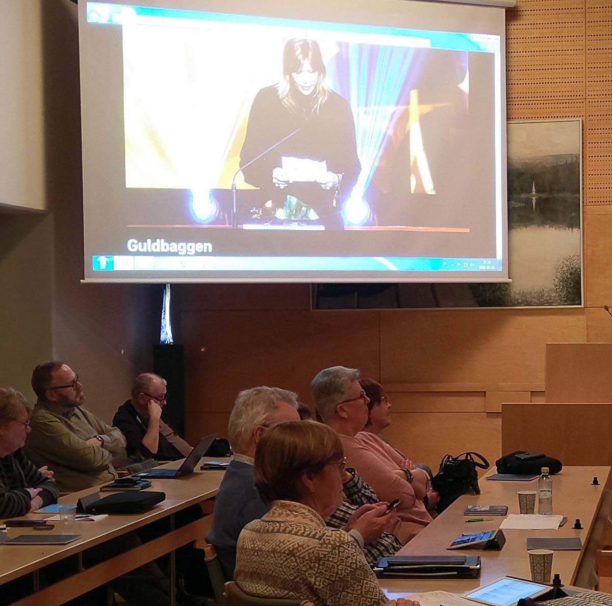 - the square från guldbaggegalan i rutan på väggen gjorde alla fullmäktigeledamöter glada till slut. (Foto: Håkan Johansson)