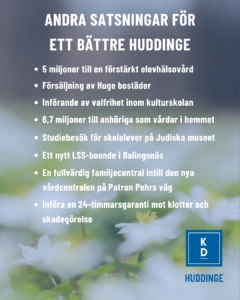 Utöver detta föreslår vi flera reformer som gör Huddinge starkare och mer medmänskligt: