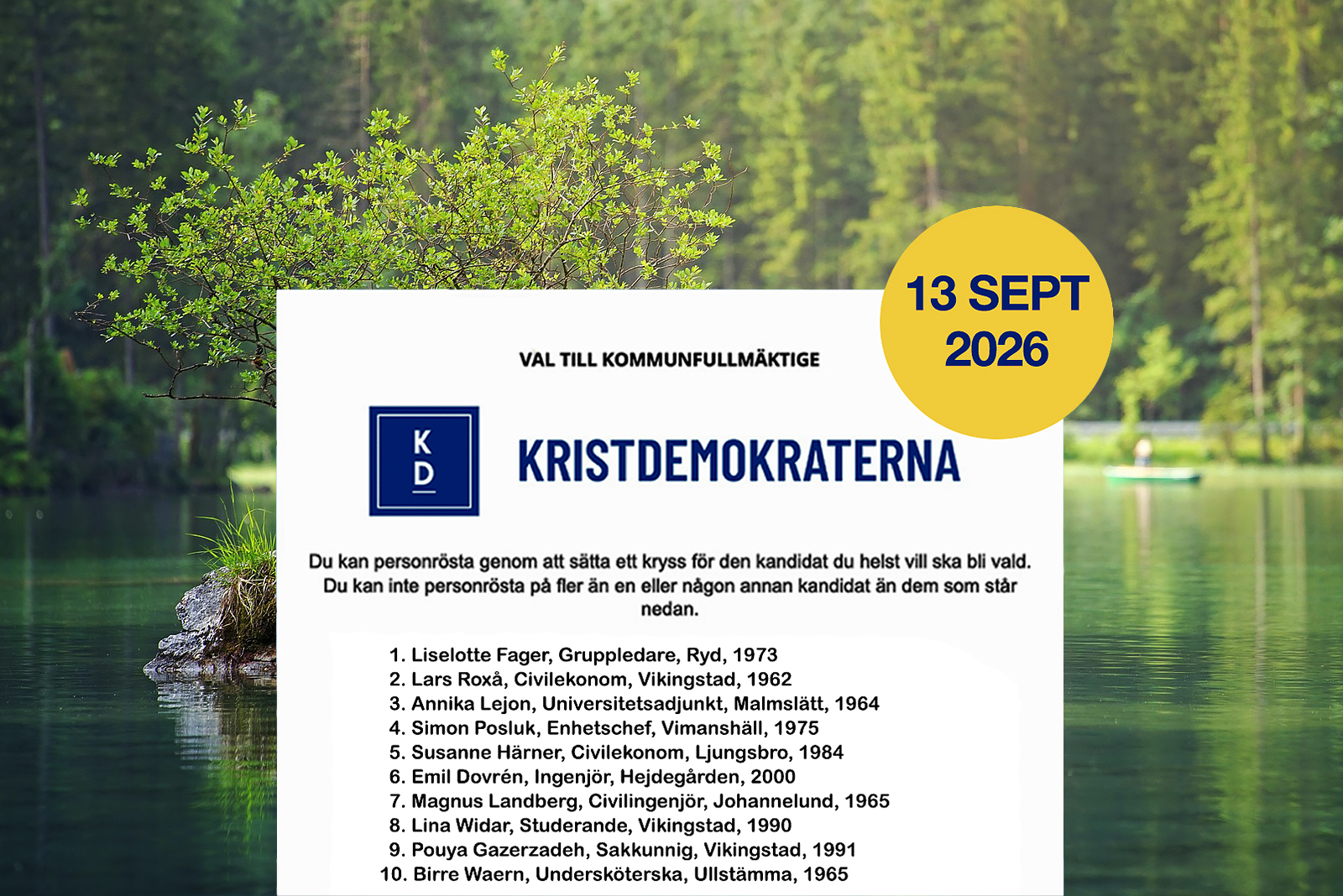”Det känns mycket positivt att vi har kunnat föreslå en valsedel med en stor bredd av kandidater, både när det gäller åldrar, yrken och bostadsort. Dessutom är det mycket glädjande att vi har 17 helt nya kandidater på valsedeln. Tio i topp på valsedeln består av både starka erfarna namn och nya engagerade kandidater, vilket ger goda förutsättningar för ett bra valresultat. Med nuvarande gruppledare Liselotte Fager som toppkandidat får vi både erfarenhet och framåtanda. Liselotte har sett till att Kristdemokraterna som mindre oppositionsparti har synts, märkts och påverkat. Det är en bra grund för att ta ledartröjan i nästa mandatperiod, med fler mandat och som styrande parti.”