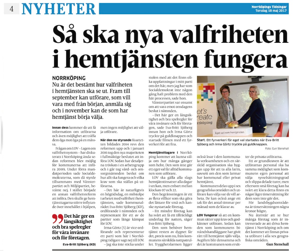 Valfrihet i hemtjänsten 18 maj 2017 skriv ut Nu är beslutet taget – Norrköpings invånare ska få möjlighet att själva välja utförare inom hemtjänsten. Ett historiskt beslut som dessutom är ett av KD:s vallöften. Så här skriver Norrköpings tidningar om hur det ska fungera. Dela detta: