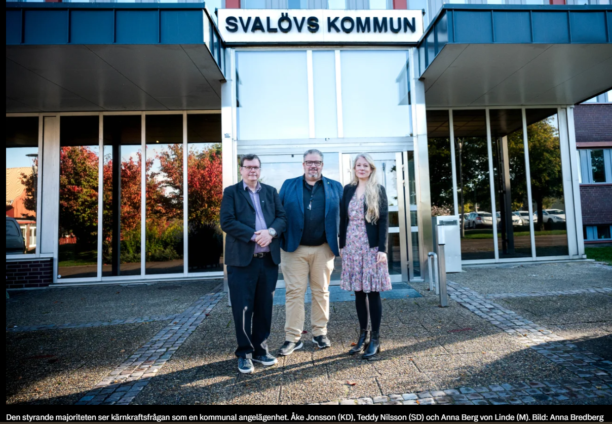 Svalövs kommuns styrande majoritet (KD, M, SD) har arbetat i kärnkraftsvänlig riktning på flera sätt. 2023 beställde man en utredning av tänkbara platser att bygga nya kärnkraftverk på. Och i december 2024 blev det klart att Svalöv är en av elva kommuner som får statligt bidrag för ett pilotprojekt kring ny kärnkraft.