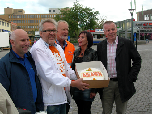 - Gottlieb Granberg (M), Arnold Carlzon (KD), Håkan Andersson (FP), Camilla Rinaldo (KD) och Hans-Göran Johansson (C) ser ut att vilja provsmaka allianstårtan. (Foto: Håkan Johansson)