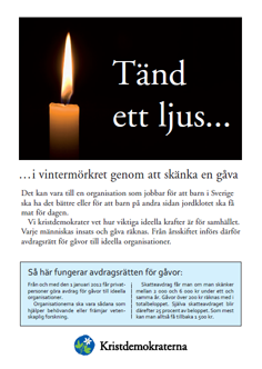 Som vanligt en lördag i advent bjuder Värnamos Kristdemokrater frusna julhandlare på glögg och pepparkakor. I år känns det extra angeläget eftersom avdragsrätten för gåvor till ideella organisationer börjar gälla från nyår. Detta är något som Kristdemokraterna har kämpat för länge. Ideella organisationer är mycket effektiva i att förmedla hjälp och se till så att den kommer fram till de som behöver den mest. Är det inte det julen handlar om – solidaritet i praktisk handling.