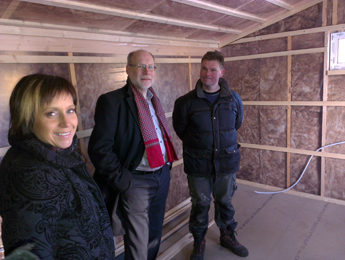 - Camilla Rinaldo Miller, ordförande för Kristdemokraterna Värnamo, Bostadsminister Stefan Attefall (KD) och Martin Alvsveden, VD för Gunnars såg, inne i en av stugorna i produktion. (Foto: Håkan Johansson)