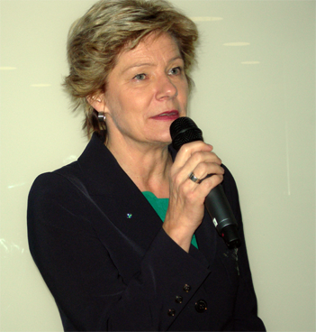 Efter Jonas fick barn- och äldreminister Maria Larsson (KD) ordet. Hon tog upp tråden från Jonas och sade att det krävs modiga politiker som vågar satsar på gummifabriken, som även hon ser som en viktig framtidssatsning.