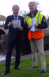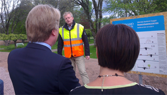 - Mannen med frisyren, Lars Adaktusson (KD), lyssnar intresserat när Ronnie Björkström berättar om de pågående arbetena med att bygga fördämningar och pumpstationer i Värnamos finpark, Åbroparken. (Foto: Håkan Johansson)