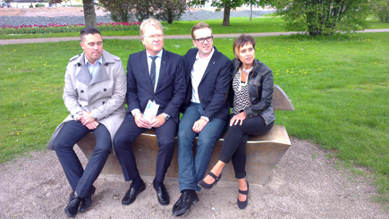 - Väl i Åbroparken ville Lars Adaktusson (KD) naturligvis provsitta Turkens bänk. Presskontakt Martin Källstrand, riksdagsledamot Andreas Carlson och kommunstyrelseledamot Camilla Rinaldo Miller var heller inte sena att bänka sig. (Foto: Håkan Johansson)