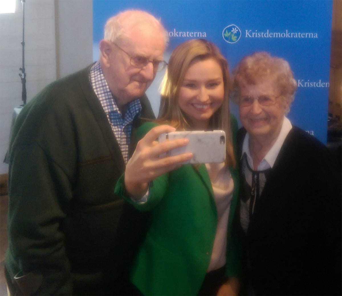 - Bertil Pettersson och Herrmy Nenkert Pettersson passade inte bara på att följa upp sin motion om kärnkraften när partiledaren var på plats, de lämnade även in en motion om fotvård till nästa Riksting. Klart att EBT ville han en selfie tillsammans med kämparna från Värnamo. (Foto: Håkan Johansson)