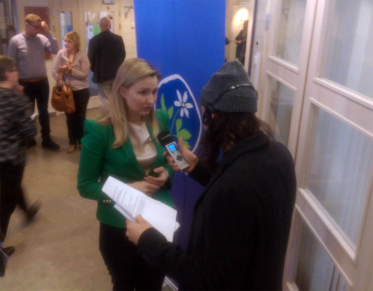 - Partiledaren hann knappt komma in i årsmöteslokalen förrän hon blev omsvärmad av media. (Foto: Håkan Johansson)