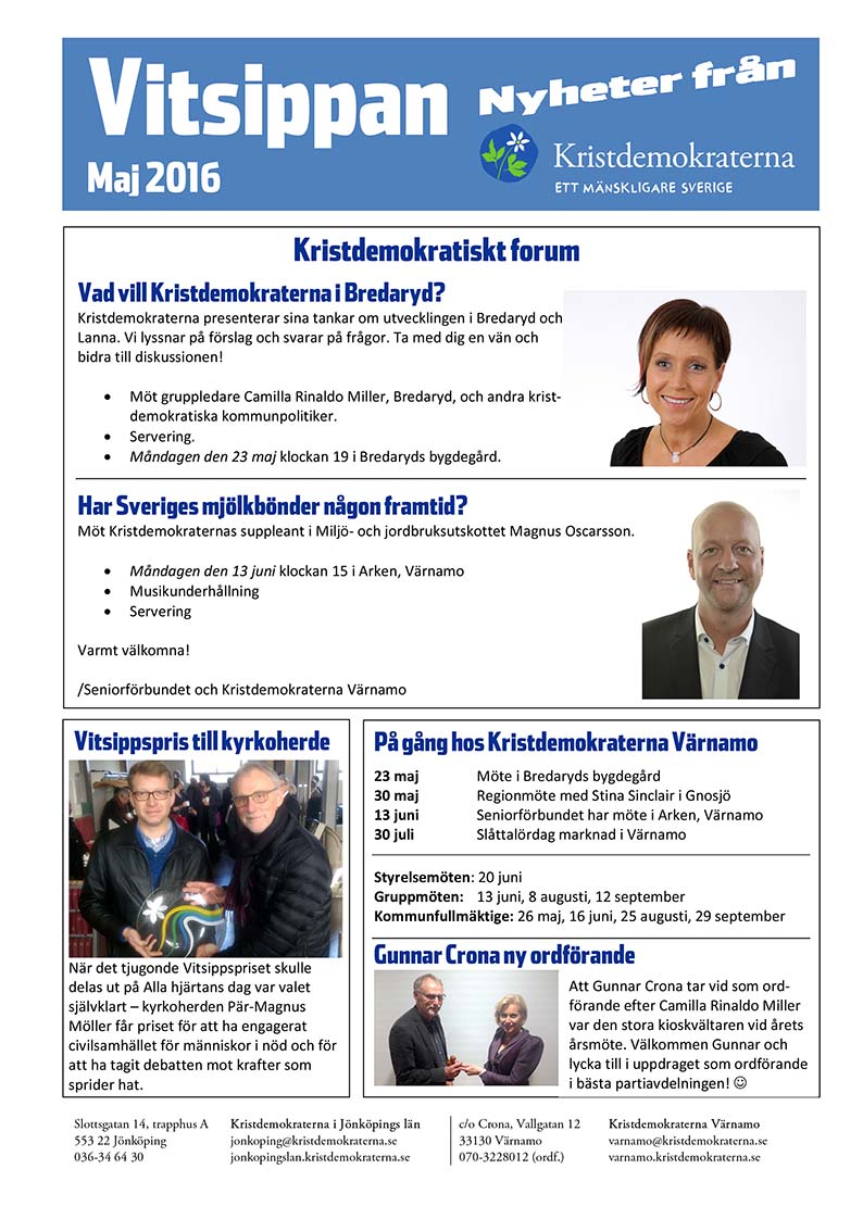 Nu kommer snart Vitsippan till medlemmarnas brevlådor! Den innehåller information  om intressanta möten under rubriken Kristdemokratiskt forum, presentation av vår nye ordförande Gunnar Crona, reportage från utdelningen av det tjugonde Vitsippspriset och mycket mer. Redan nu kan du läsa det på webben: