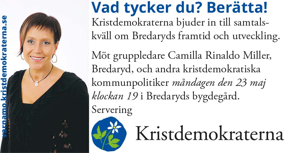 - Vad tycker du? Berätta! Kristdemokraterna bjuder in till samtalskväll om Bredaryds framtid och utveckling. Möt gruppledare Camilla Rinaldo Miller, Bredaryd, och andra kristdemokratiska kommunpolitiker måndagen den 23 maj klockan 19 i Bredaryds bygdegård. Servering Kristdemokraterna varnamo.kristdemokraterna.se
