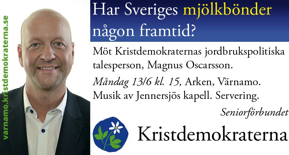 - Har Sveriges mjölkbönder någon framtid? Möt Kristdemokraternas jordbrukspolitiska talesperson, Magnus Oscarsson. Måndag 13/6 kl. 15, Arken, Värnamo. Musik av Jennersjös kapell. Servering. Seniorförbundet. Kristdemokraterna. varnamo.kristdemokraterna.se