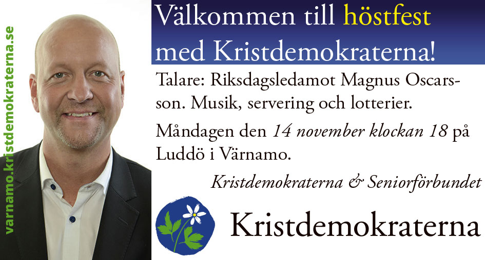 - Välkommen till höstfest med Kristdemokraterna. Talare: Riksdagsledamot Magnus Oscarsson. Musik, servering och lotterier. Måndagen den 14 november klockan 18 på Luddö i Värnamo. Kristdemokraterna och Seniorförbundet