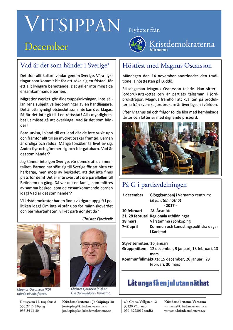 I morgon kommer medlemsbladet Vitsippan till alla medlemmar! Det sista numret för året innehåller ett reportage från höstfesten, en tänkvärd artikel om ensamkommandes situation och mycket mer. Redan nu kan du läsa det på webben: