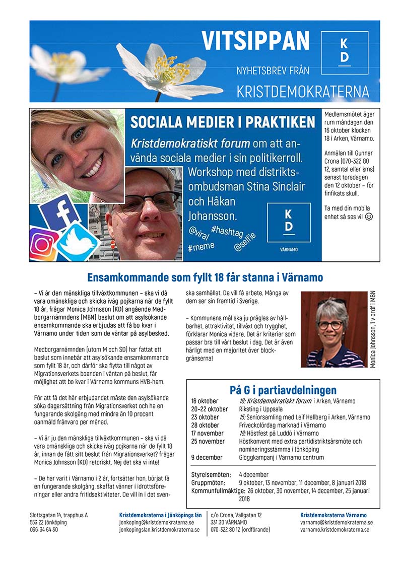 Nu lämnar snart medlemsbladet Vitsippan pressarna! Håll utkik i brevlådan efter oktobernumret där du kan läsa om Värnamo kommuns beslut att låta ensamkommande som fyllt 18 år bo kvar och om Kristdemokraternas budgetar för staten och regionen. Annars läser du helt enkelt Vitsippan här på webben: