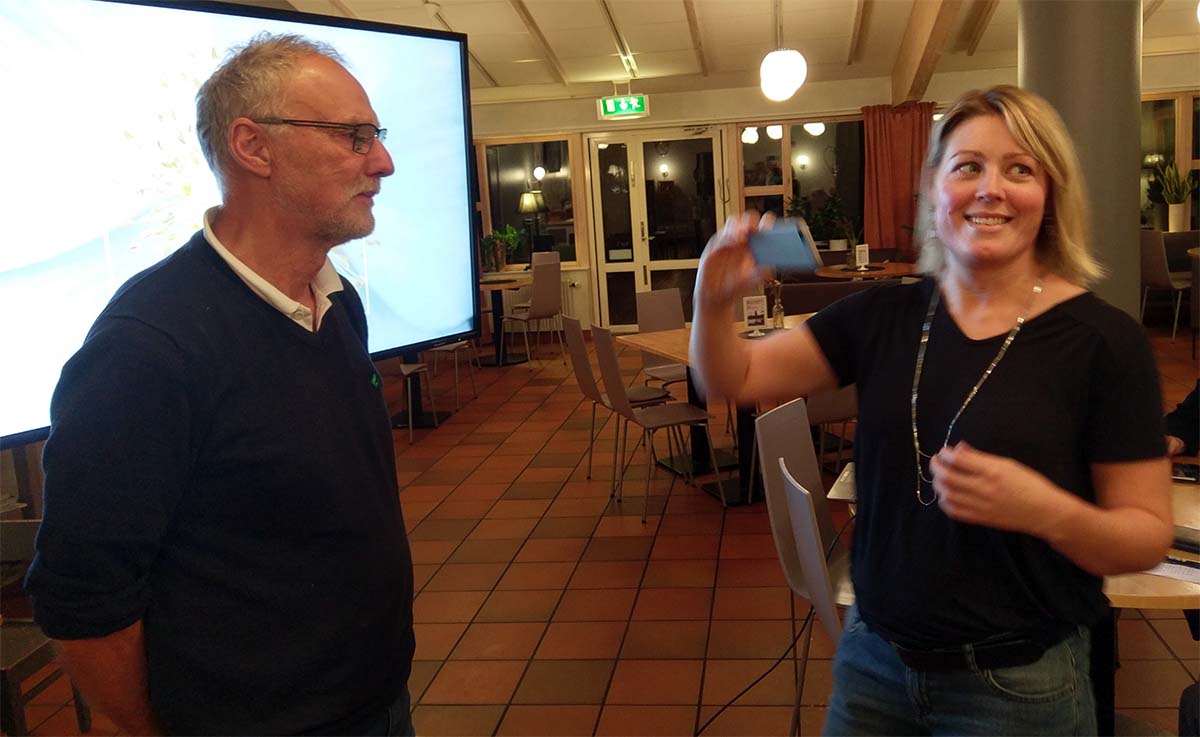 - Gunnar Crona förklarar Värnamo Energis bredbandssatsning så bra att Stina Sinclair tappar hakan. (Foto: Håkan Johansson)