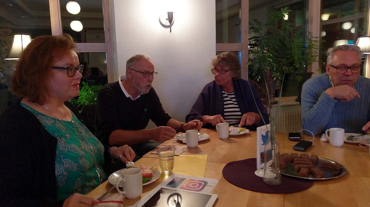 - Gott med räkmacka tycker Margareta Lindahl, Arnold Carlzon, Gunnel Youngström och Stina Sinclair vid twitterbordet. (Foto: Håkan Johansson)