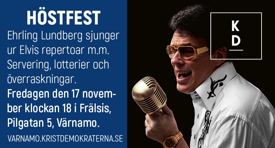 Det blev fullt på Frälsis i Värnamo när Kristdemokraterna hade sin årliga höstfest i kväll. Många hade säkert kommit för Elvis skull, alltså Malmbäcks egen Elvis – Ehrling Lundberg. Han underhöll under kvällen och lyckades skapa en god elvisatmosfär i lokalen. Inte minst de omisskännliga elvismovesen fick de över femtio deltagarna att kippa efter andan av förtjusning.