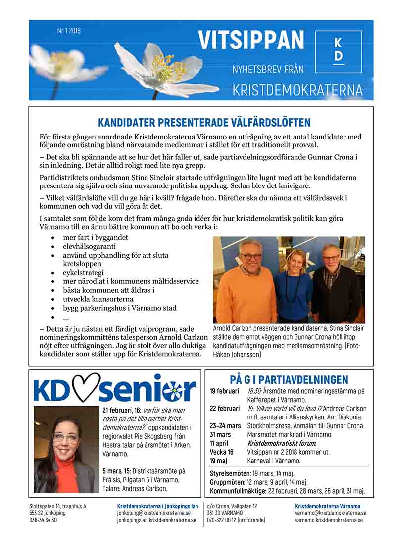 Nu är medlemsbladet Vitsippan på väg ut till alla medlemmar i Kristdemokraterna Värnamo! Där kan du läsa om kristdemokratiska välfärdslöften för Värnamo, Kristdemokraternas viktigaste fråga i valet och mycket mer. Vill du inte vänta på att Vitsippan ska dimpa ner i brevlådan så läser du den enkelt här på webben:
