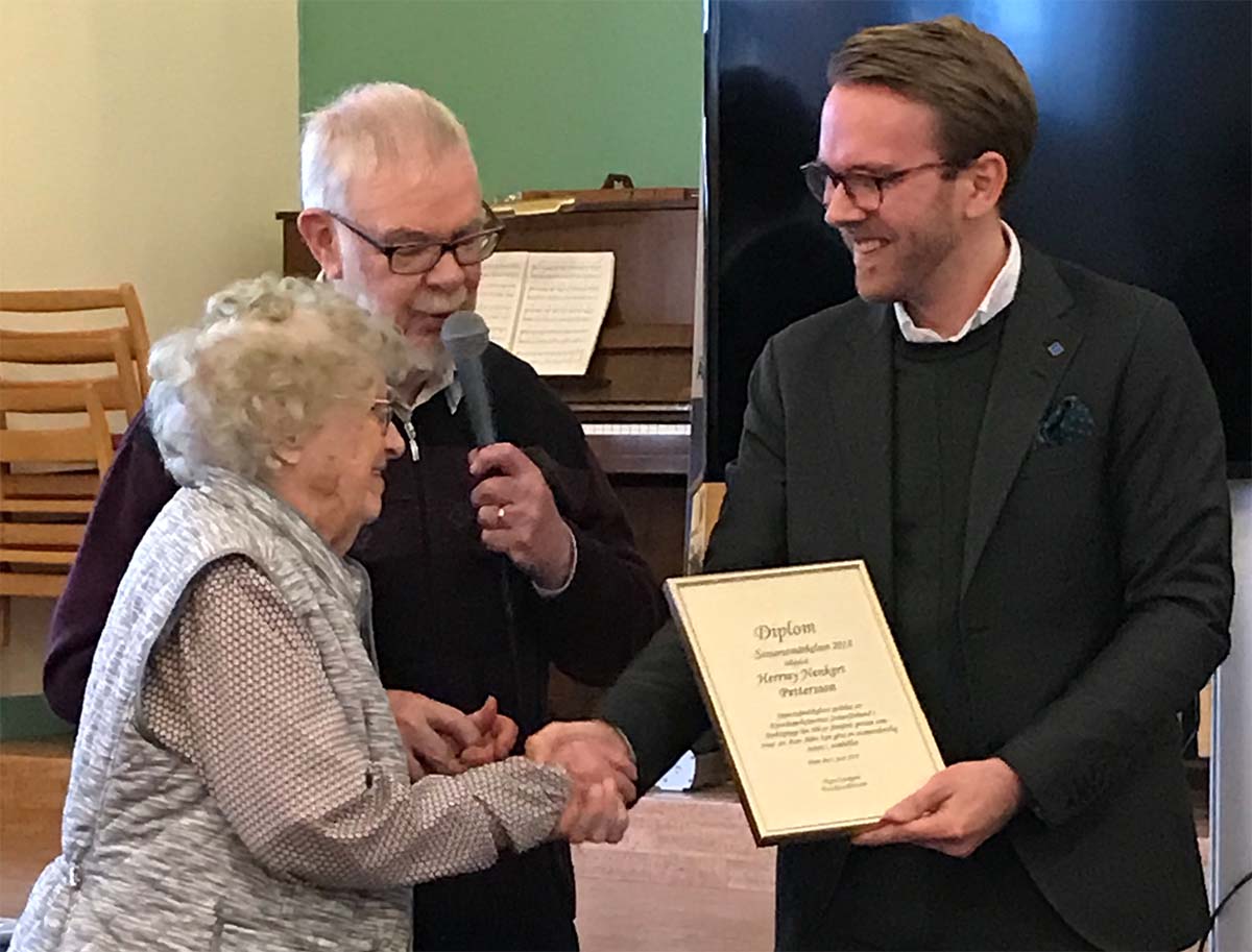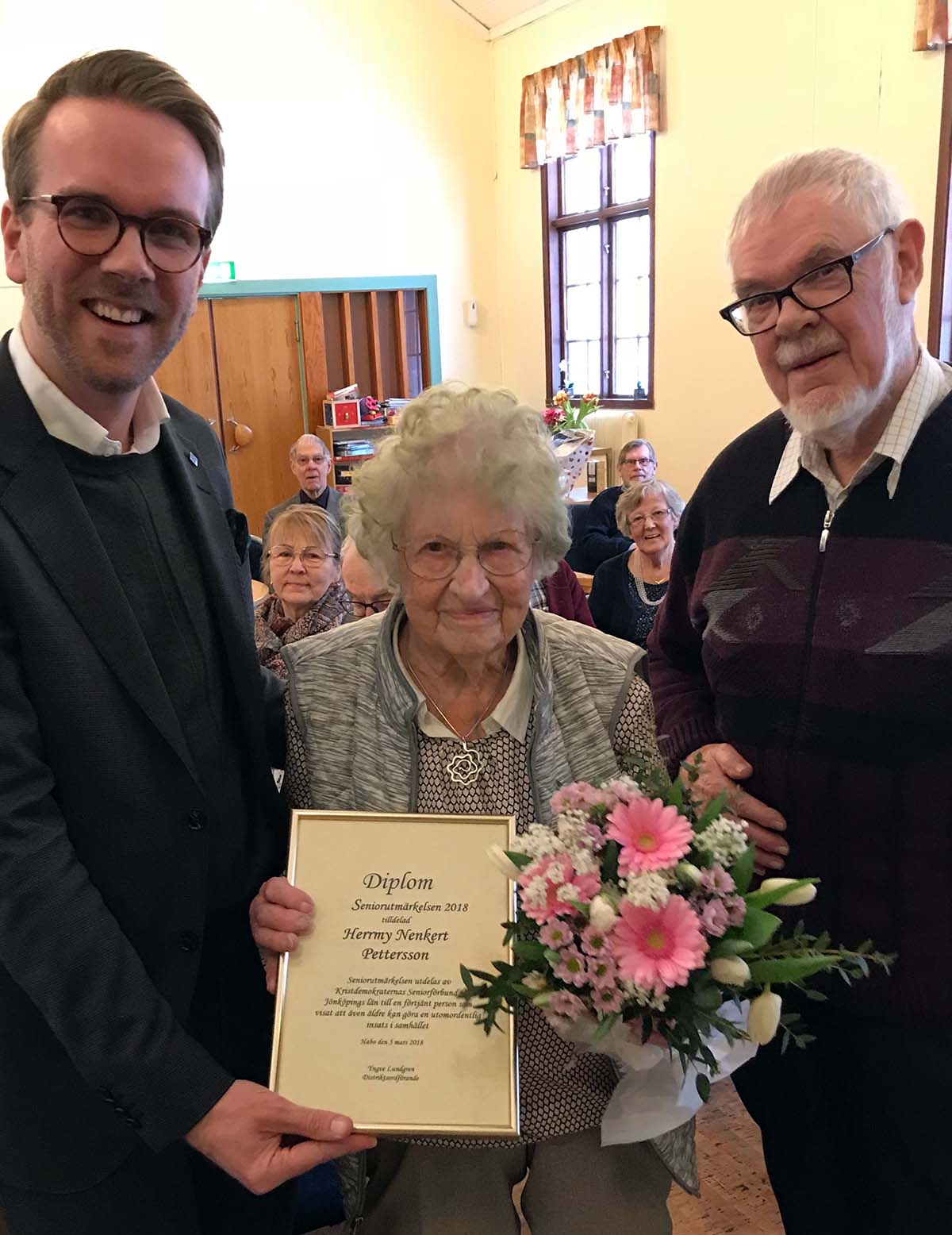 – Vilken ära att få dela ut Seniorutmärkelsen 2018 till 95-åriga Herrmy Nenkert Pettersson på seniorförbundets i Jönköpings läns årsmöte, säger Andreas Carlson (KD). Hon har gjort stora insatser för partiet. Och fortsätter ihärdigt kämpa för Kristdemokraterna.
