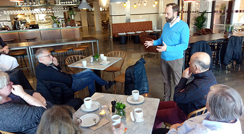 - Tobias Hörnquist berättar om Gummifabriken i Värnamo för intresserade kristdemokrater. (Foto: Håkan Johansson)