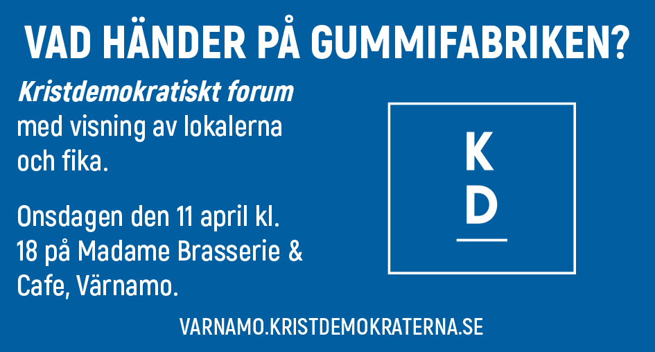 - VAD HÄNDER PÅ GUMMIFABRIKEN? Kristdemokratiskt forum med visning av lokalerna och fika. Onsdagen den 11 april kl. 18 på Madame Brasserie Café, Värnamo. varnamo.kristdemokraterna.se
