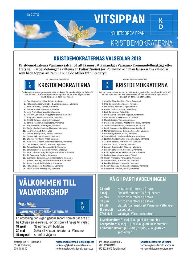 Kristdemokraterna fokuserar på tillgänglighet och på att hela länet ska leva och utvecklas! Det, och partiets valsedlar i kommunvalet, kan du läsa mer om i nya numret av medlemsbladet Vitsippan som just nu är på väg ut till medlemmarnas brevlådor. Vill du inte vänta på att Vitsippan ska dimpa ner i brevlådan så läser du den enkelt här på webben: