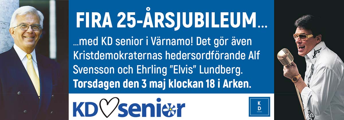 - Fira 25-årsjubileum med KD senior i Värnamo! Det gör även Kristdemokraternas hedersordförande Alf Svensson och Ehrling ”Elvis” Lundberg. Torsdagen den 3 maj klockan 18 i Arken.