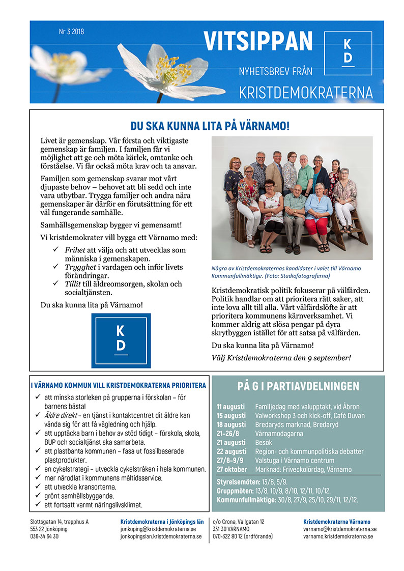 Senaste numret av medlemsbladet Vitsippan handlar om valet. Kristdemokraterna Värnamo går till val på temat Du ska kunna lita på Värnamo! Redan nu kan du läsa mer om våra viktigaste valfrågor och kika i valkalendern här på webben:
