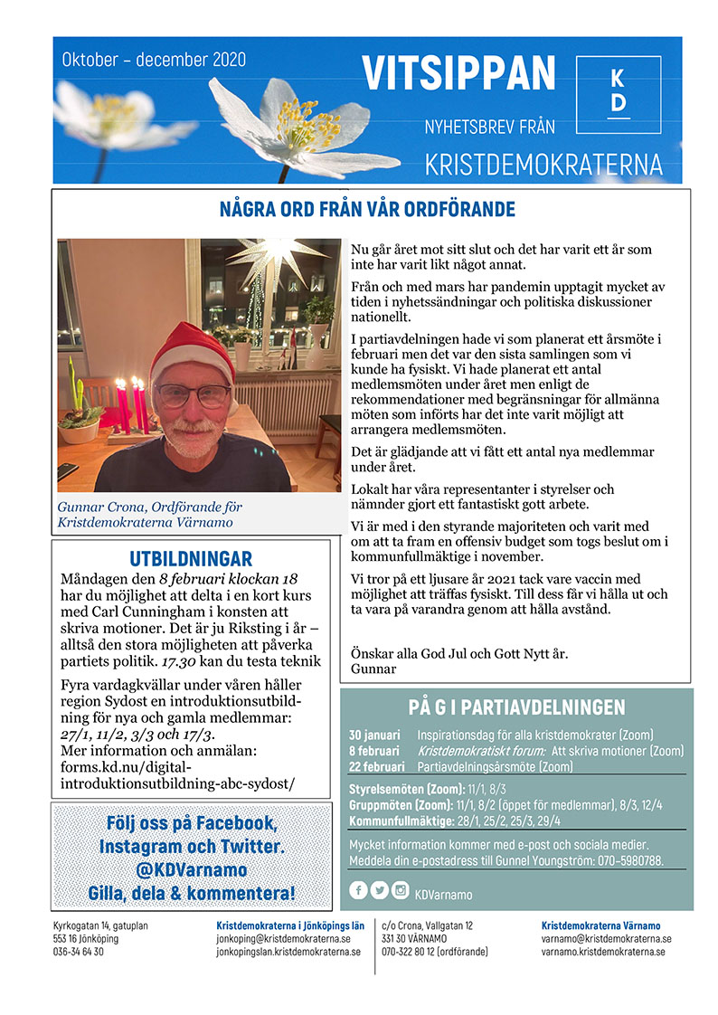 Även Vitsippan 3-4 2020 är ett dubbelnummer och på rask väg till brevlådorna. I detta nummer av vårt medlemsblad kan du bland annat läsa en nyårsönskan från vår ordförande och information om årsmötet och andra planerade aktiviteter. Redan nu kan du läsa det här på webben.