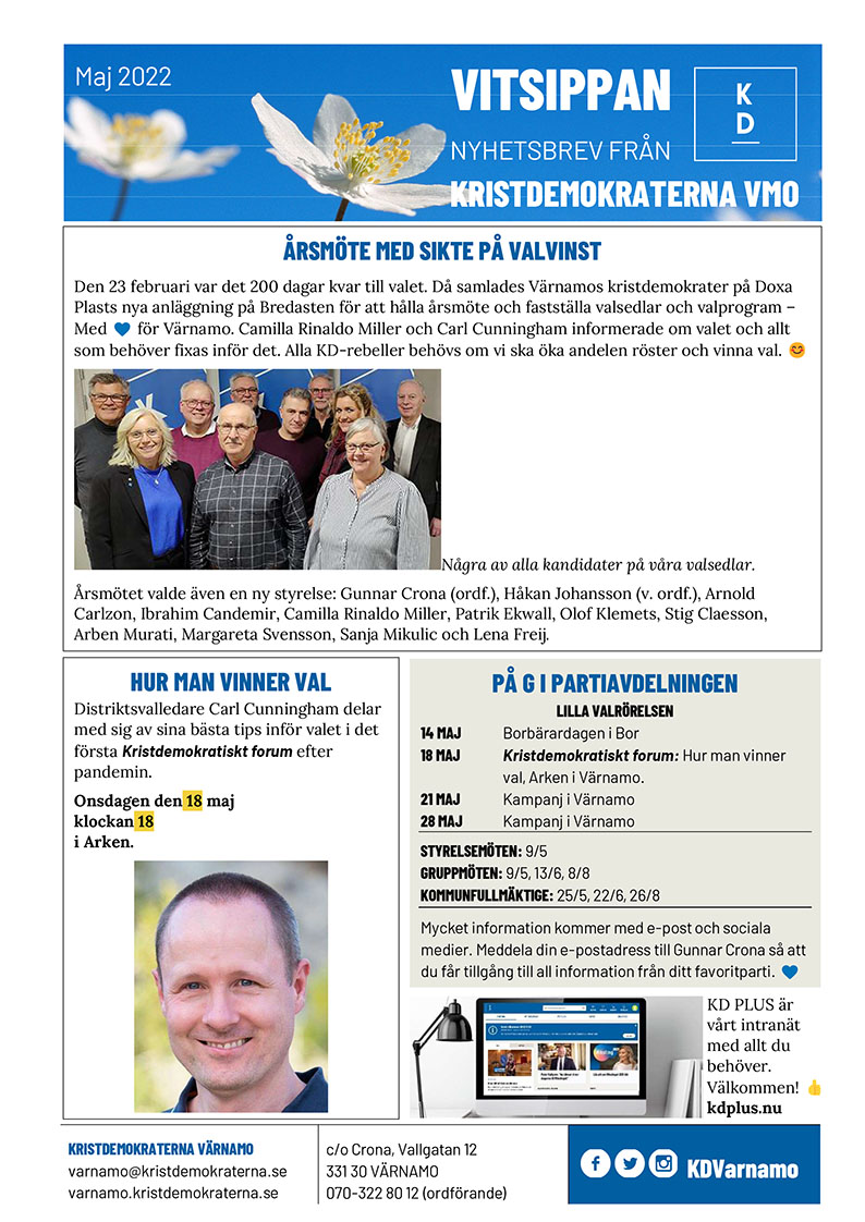 Vitsippan maj 2022 rapporterar från årsmötena och informerar om kommande arrangemang. Missa inte Kristdemokratiskt Forum om hur man vinner val.