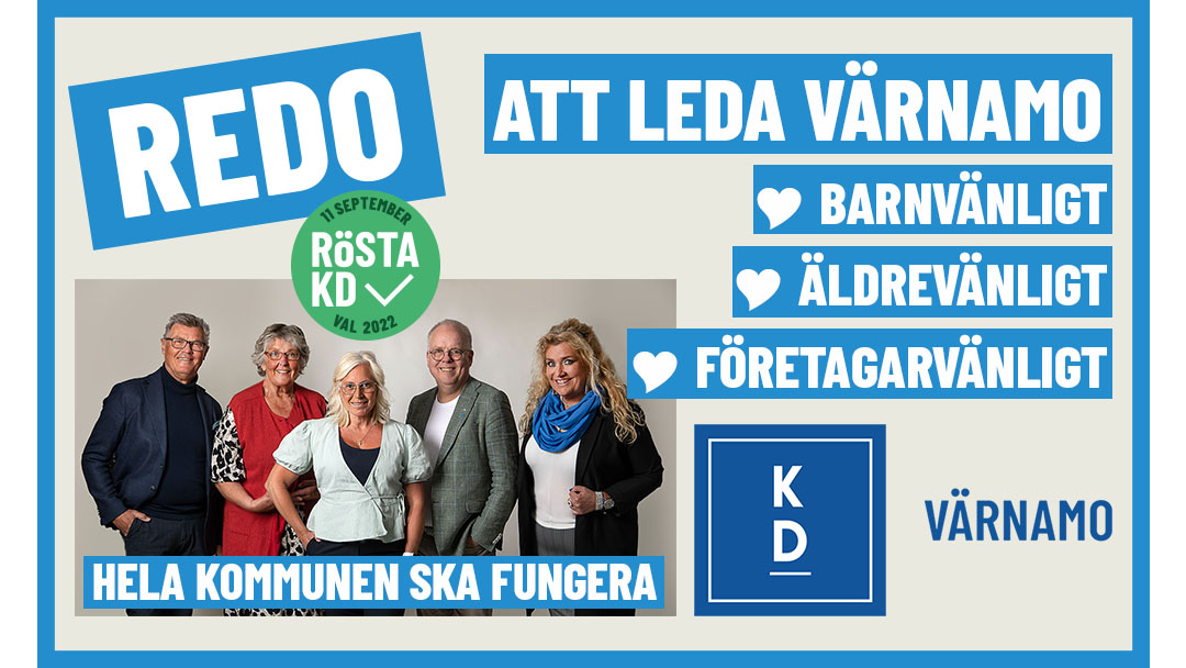 - 2022-08-25: REDO att leda Värnamo barnvänligt, äldrevänligt, företagarvänligt. Hela kommunen ska fungera.